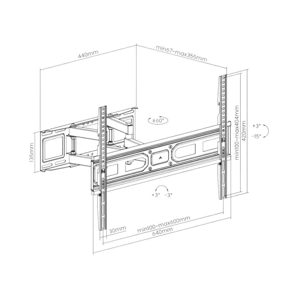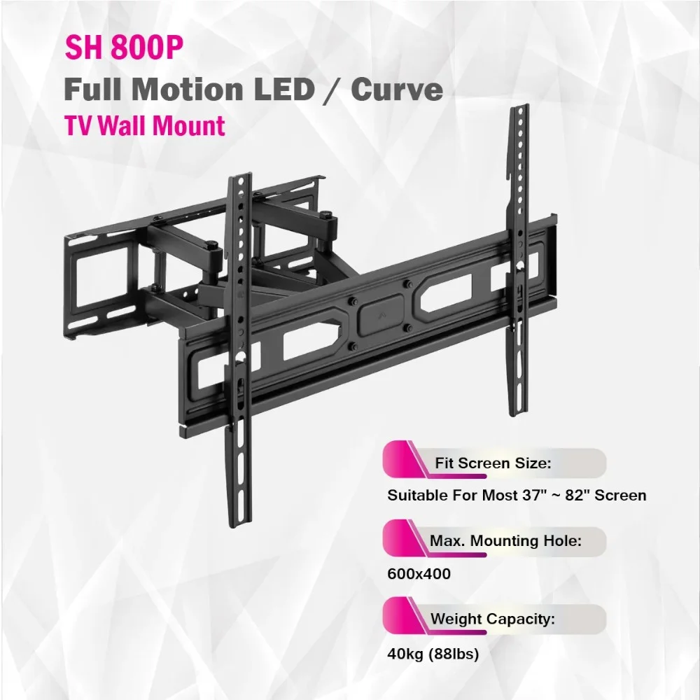 The SH 800P is an economical Full-Motion TV Wall Mount designed for LED and curved TVs, offering versatility and affordability. With dimensions of 355x640x420mm (14″x25.2″x16.5″), it’s suitable for most 37 to 80-inch screens, providing a secure and flexible mounting solution. Constructed from steel and plastic materials, this wall mount ensures durability and reliability.It features VESA compatibility, supporting a wide range of mounting hole patterns, including 100×100, 100×150, 150×100, 100×200, 200×100, 150×150, 200×200, 300×200, 400×200, 300×300, 400×300, 600×200, 400×400, 600×300, and 600×400, with a maximum mounting hole size of 600x400mm. The mount can accommodate TVs with a weight of up to 40kg (88lbs).The profile of the SH 800P ranges from 67mm to 355mm (2.6″ to 14″), allowing you to achieve the desired distance between the TV and the wall. It offers a tilt range of +3° to -15°, allowing you to adjust the screen’s angle for comfortable viewing. Additionally, it provides a swivel range of +60° to -60°, offering flexibility in positioning your TV.This wall mount is designed for easy installation and includes both VESA and universal mounting options. Overall, the SH 800P Full-Motion TV Wall Mount is a cost-effective choice for those seeking a practical and reliable solution to mount their LED or curved TVs securely and adjust them for optimal viewing angles.