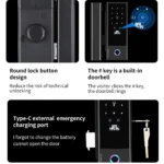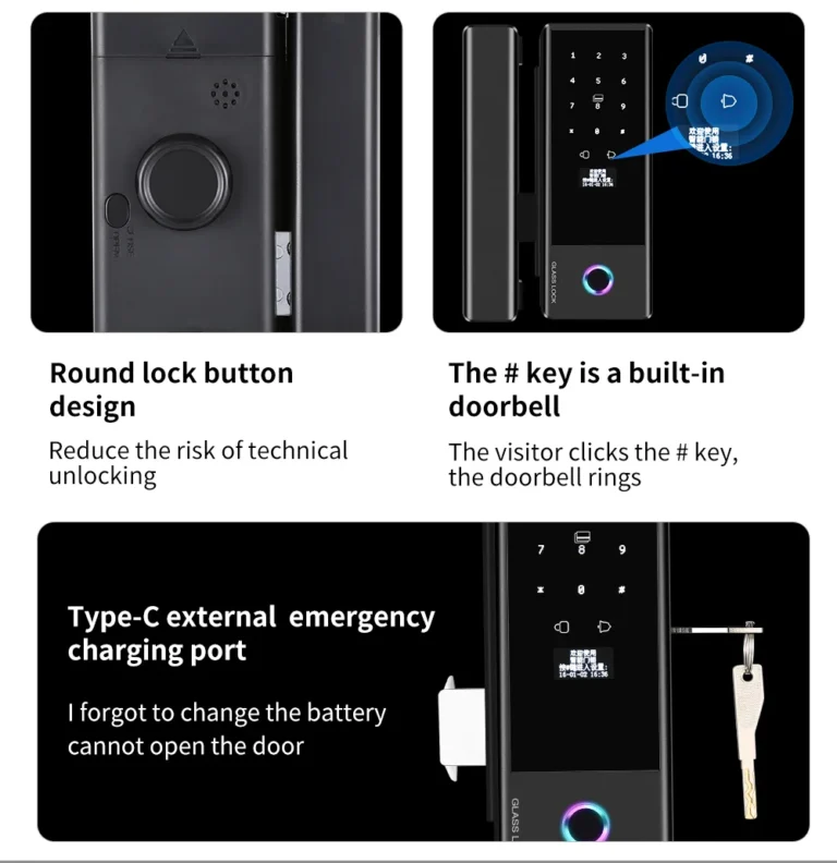 A low‑battery indicator warns you in advance. If power runs out, you can temporarily energise the lock with a power bank via the Type‑C port.